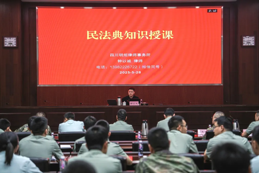 在《中华人民共和国民法典》颁布五周年之际,为深化法治强军实践、提升官兵法治素养,2025年5月28日,四川明炬律师事务所钟以诚律师应邀为某师级部队500余名官兵及文职人员开展《民法典》专题普法讲座,聚焦“见义勇为”“高空抛物”“婚姻家庭编”三大官兵关切领域展开精准解读。
